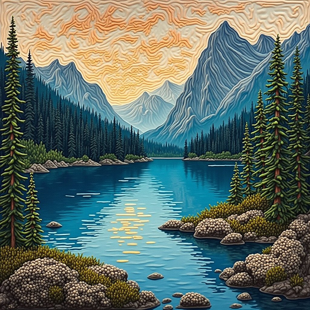 Experience the beauty of a mountain lake with coils of blue, green, and brown. Ideal for a calming, reflective space.