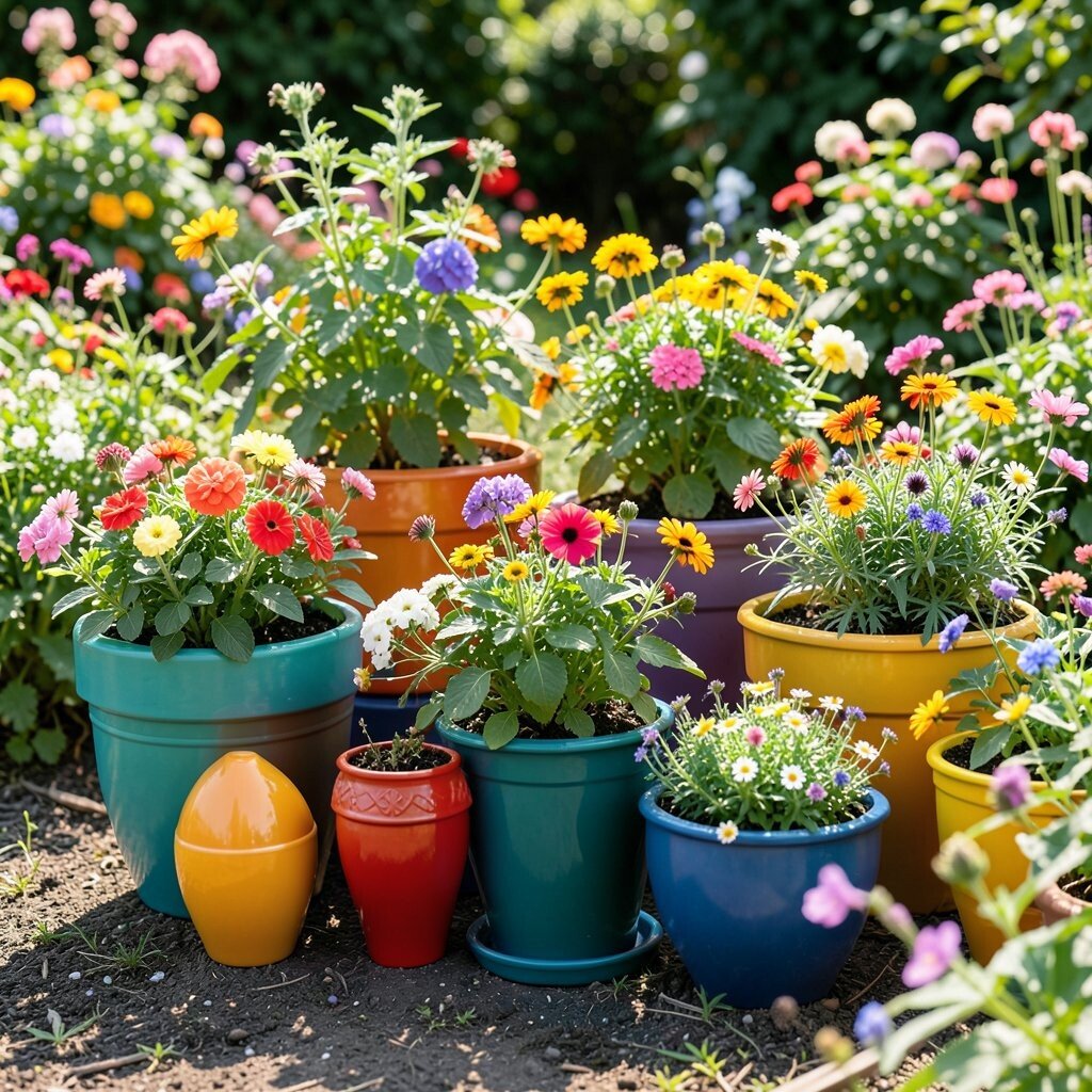Mix and match colors for an eclectic look. You can find affordable options at thrift stores. They’re easy to rearrange, letting you refresh your garden’s look whenever you wish.