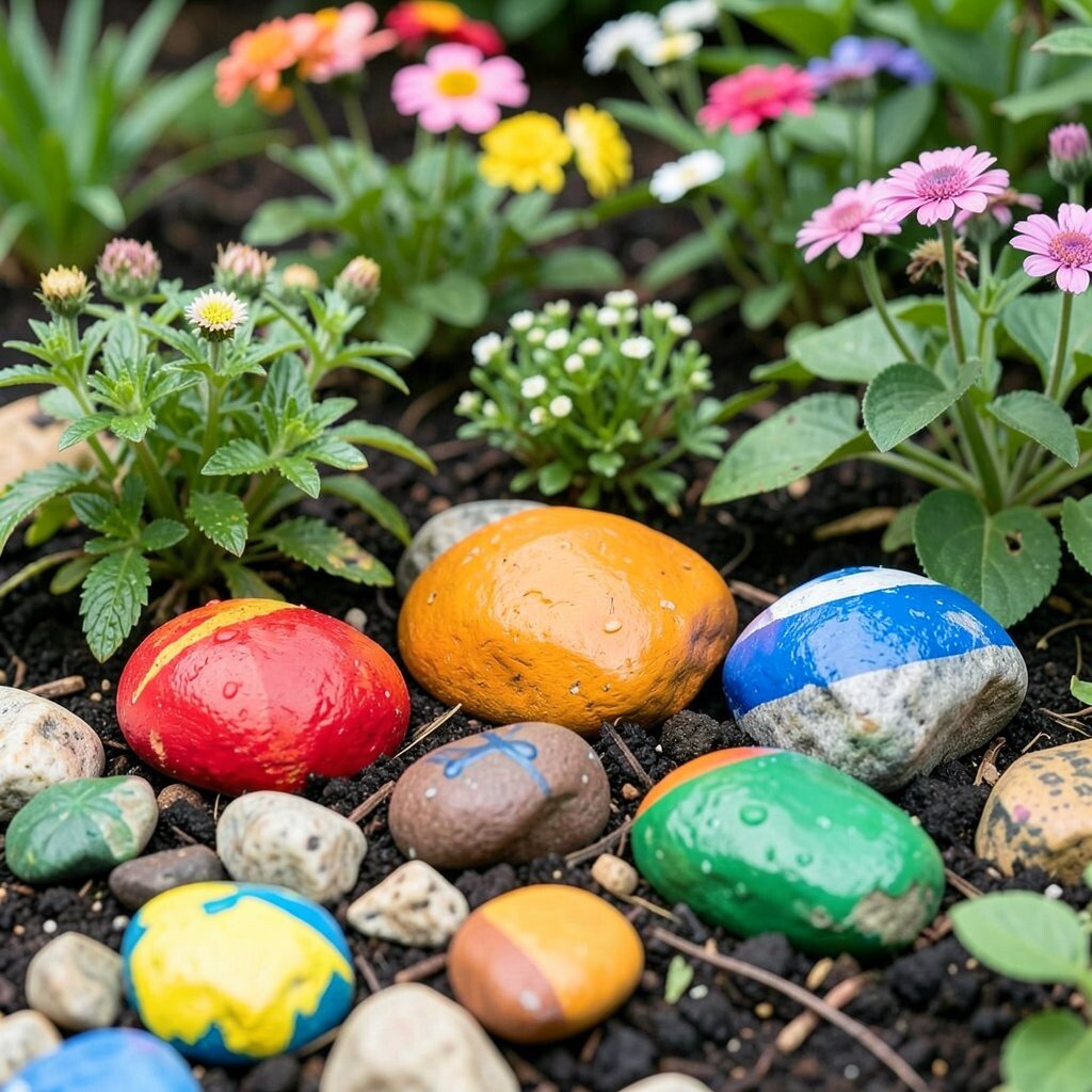 Painted rocks are a simple yet effective way to add color. Use them to label plants or as decorative pieces. Their small size makes them perfect for adding pops of color between plants.