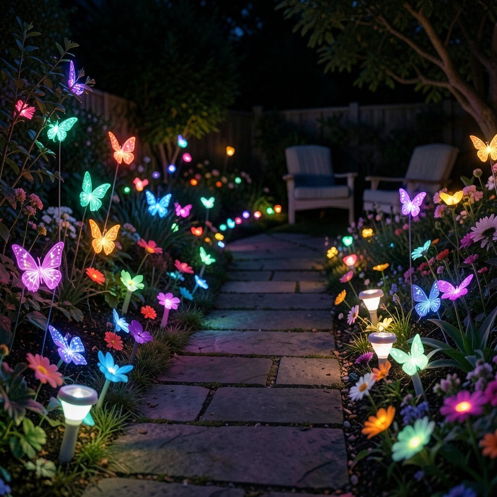 Light up your garden with colorful solar-powered lights. These eco-friendly lights charge during the day and sparkle at night. They come in various shapes, like butterflies or flowers, and add magic to your space.