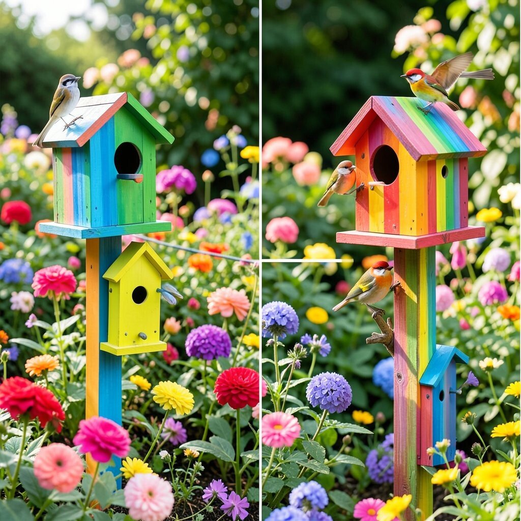 Birdhouses can be both functional and decorative. Painted in bright, bold colors, they attract birds and add charm to your garden. Choose colors that complement your blooms or go wild with a rainbow palette.