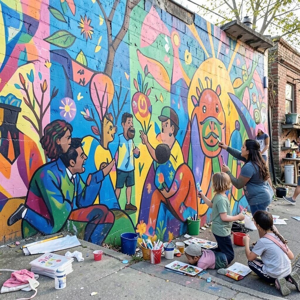 A community art mural is a large, colorful painting on a wall that tells a story or shares a message. It’s a creative way to beautify your neighborhood and bring people together. Painting together fosters teamwork and creativity.