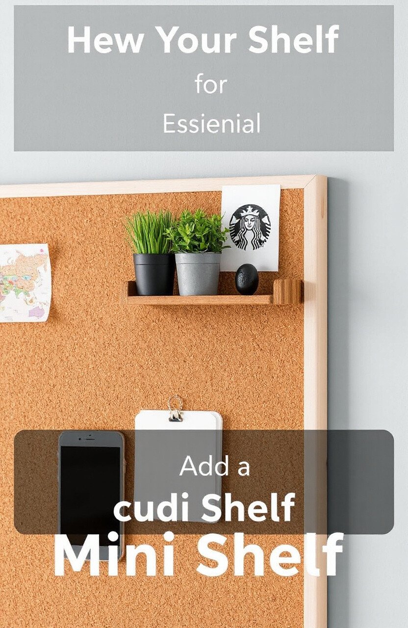 Attach a small shelf to your cork board for extra storage. This is perfect for holding small plants or office supplies.