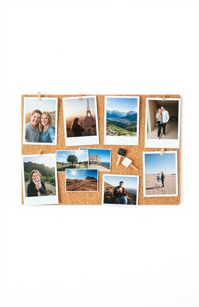 Turn your cork board into a personal photo gallery. Pin up photos of friends, family, and adventures. Arrange them in a grid or collage style.