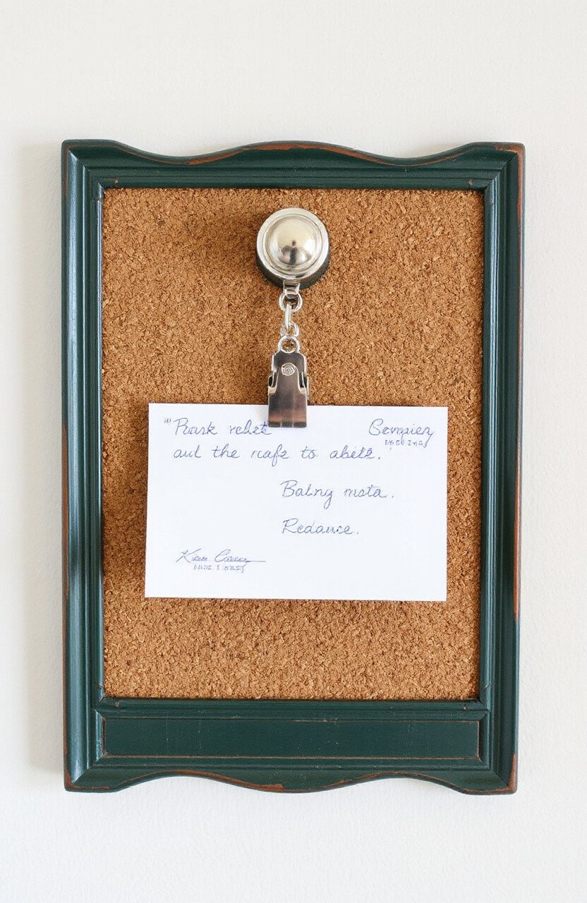 Mount a clipboard to your cork board for holding papers or notes. It’s a practical addition for quickly accessing important documents.