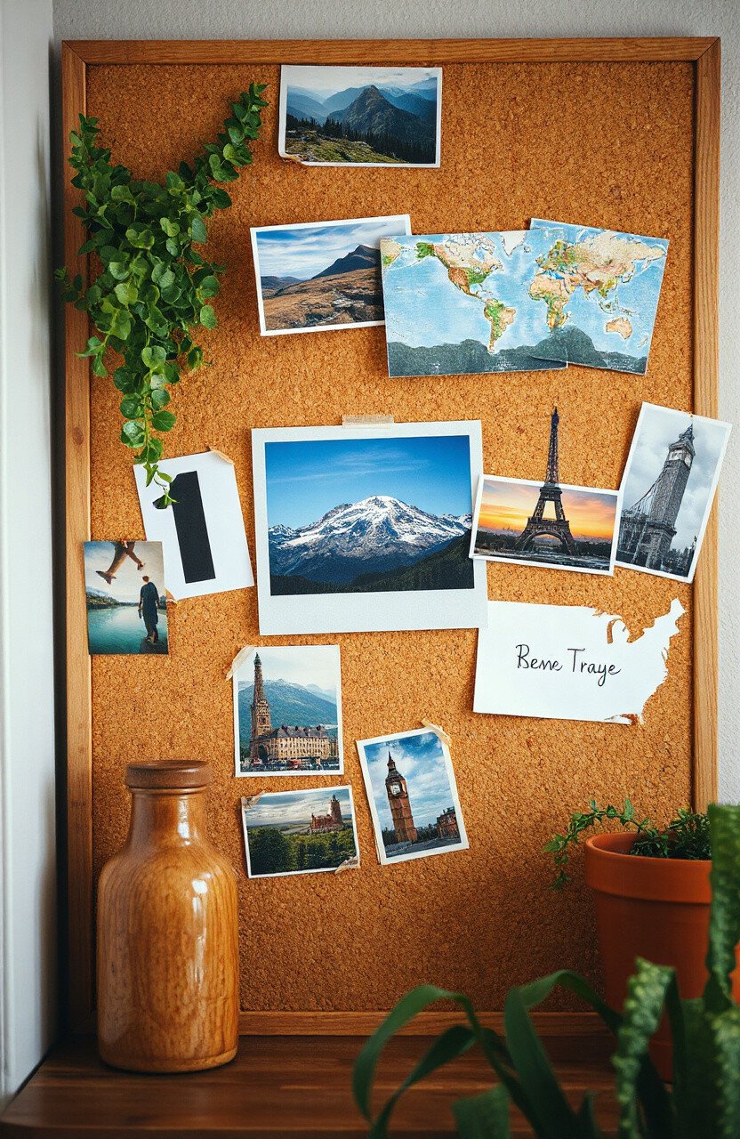 Pin a cork map on your board and mark places you’ve visited or dream of visiting. It’s a wonderful way to track your travels.