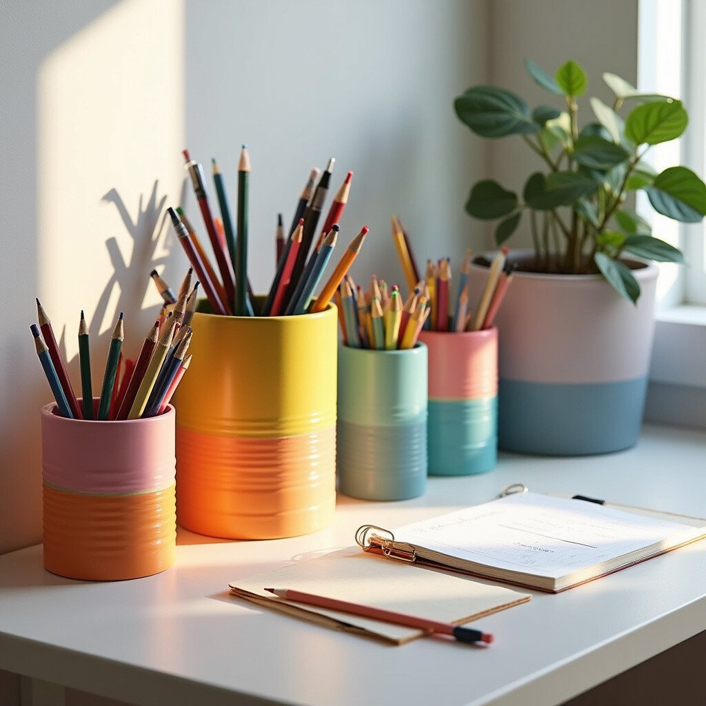 Keep your pens and pencils organized with a multi-colored holder. Choose a holder with compartments in different shades or make your own with painted jars or cans.
