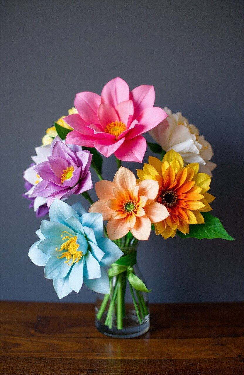 Craft paper flowers for a bouquet that never wilts. Use colorful paper and wire to create lifelike blooms. They brighten up any room and make lovely gifts.