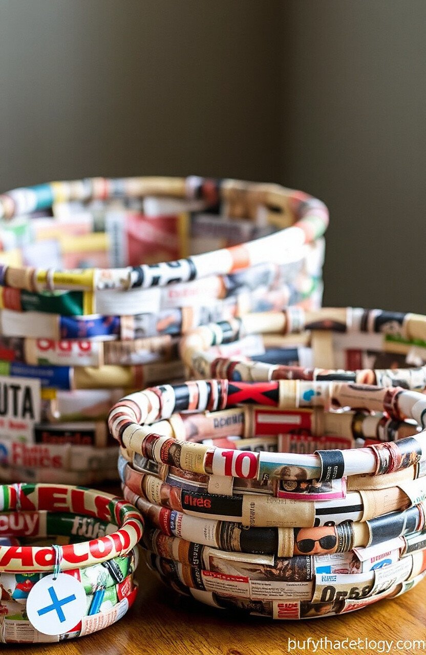 Weave old magazine pages into colorful baskets. These baskets are perfect for organizing and add a pop of color to your space. It’s an eco-friendly hack that turns clutter into creativity.