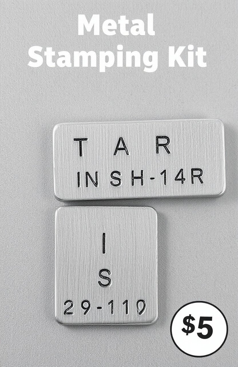 Personalize jewelry and decor with a metal stamping kit. The kit includes letters, numbers, and symbols for endless possibilities.