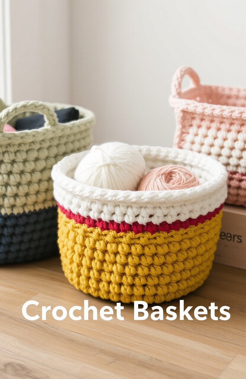 Crochet baskets are both functional and decorative. They’re perfect for organizing or adding a pop of color to any room.