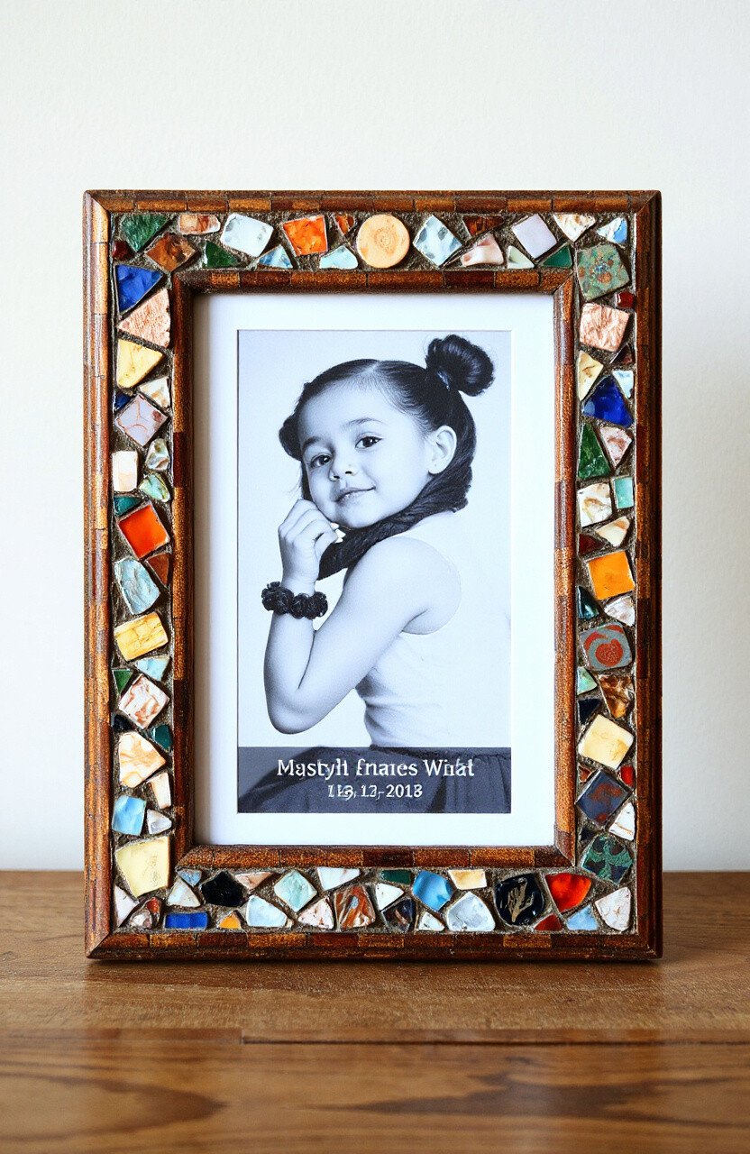 Mosaic frames are a colorful way to display photos. Use tiles, glass, or broken china for unique designs.