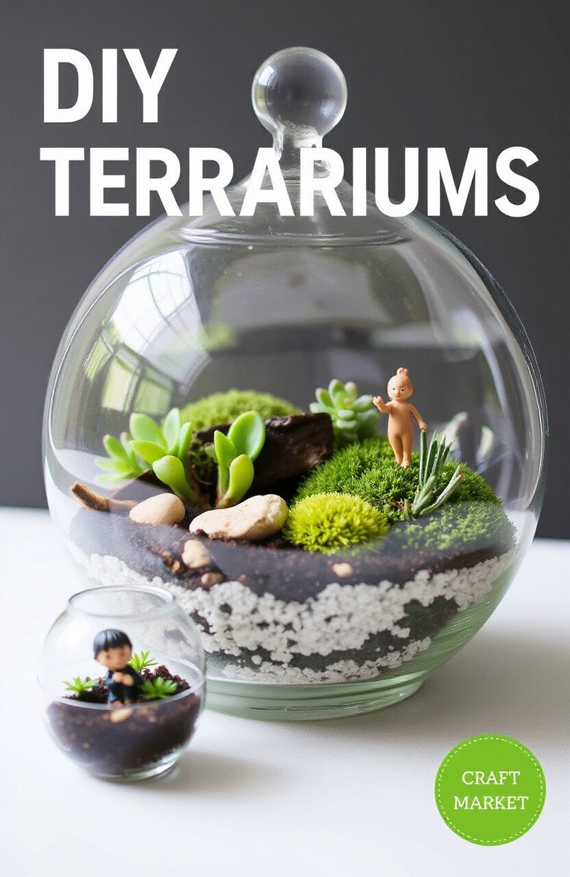 Create your own miniature garden with a terrarium. Use glass containers, soil, and tiny plants.