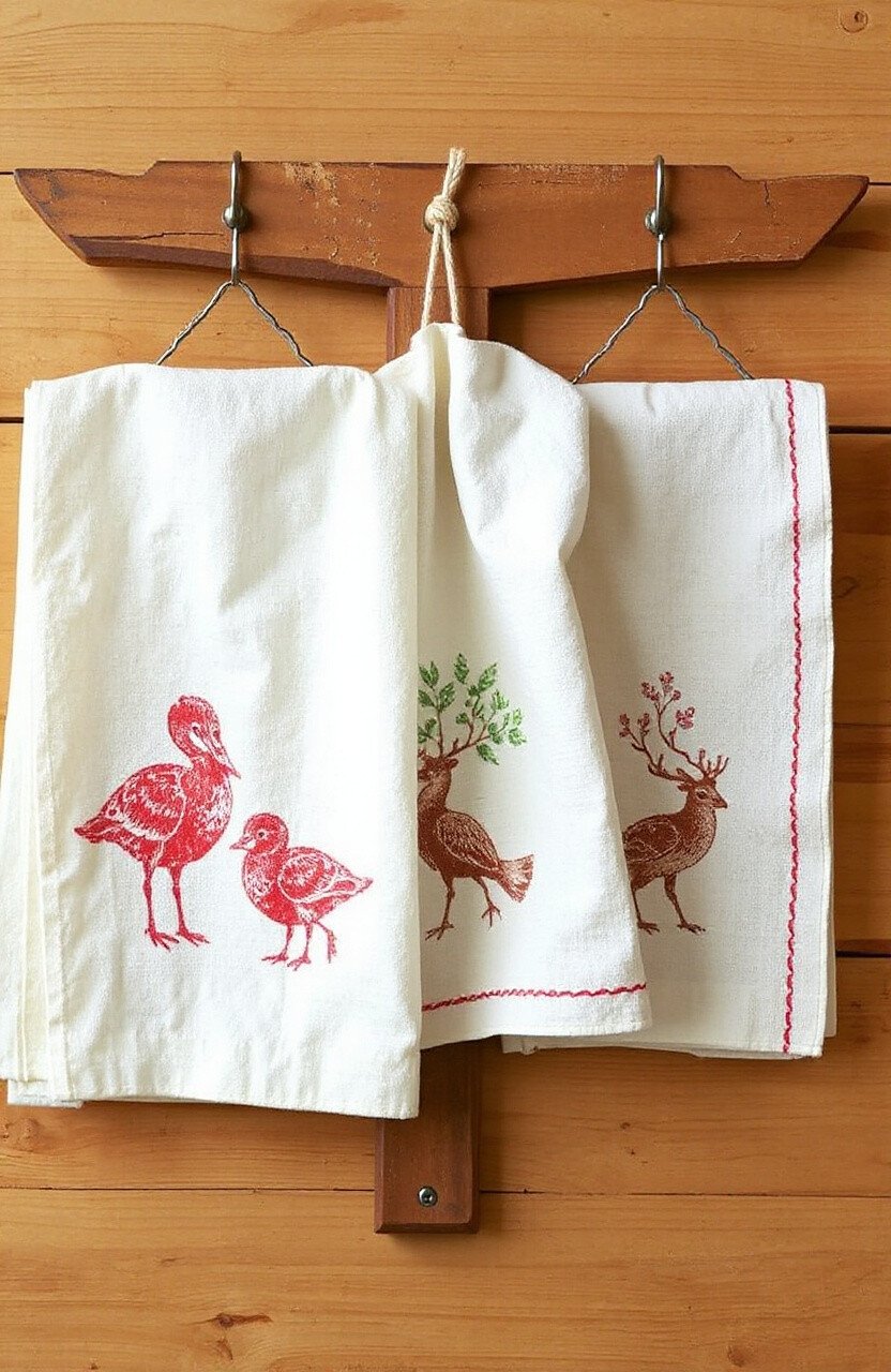 Hand-stamped tea towels bring charm to the kitchen. Create designs with stamps or stencils.