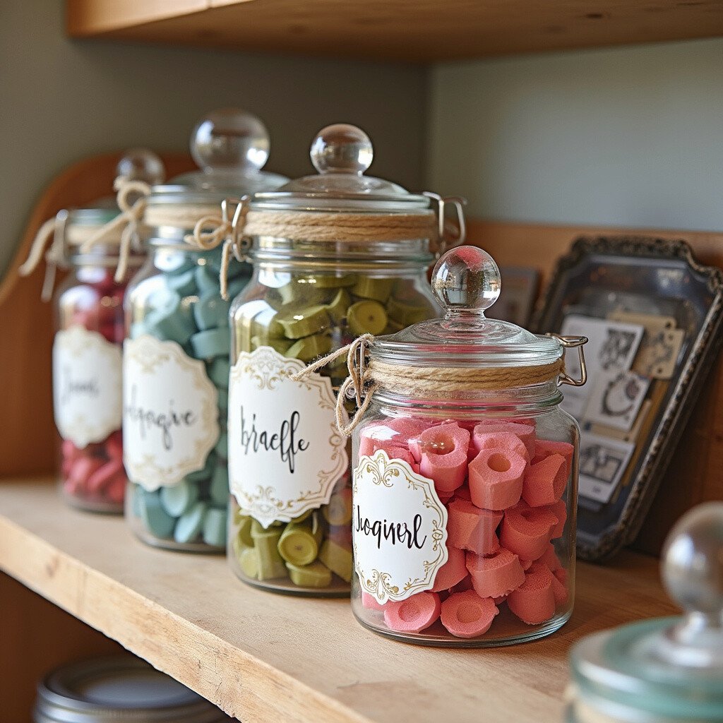 Glass jar labels are perfect for organizing buttons, beads, and other small items. They add a vintage charm to your craft space.