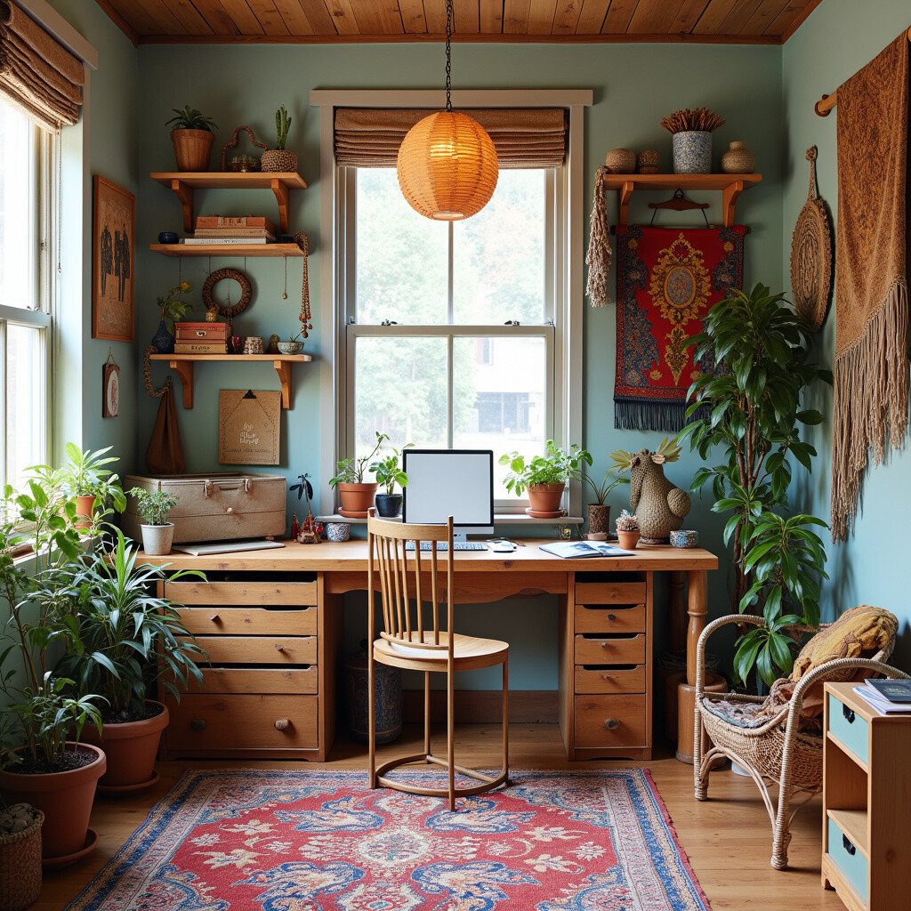 Free-spirited and eclectic, a bohemian craft room is full of color and texture. This layout is perfect for those who love mixing patterns and styles.