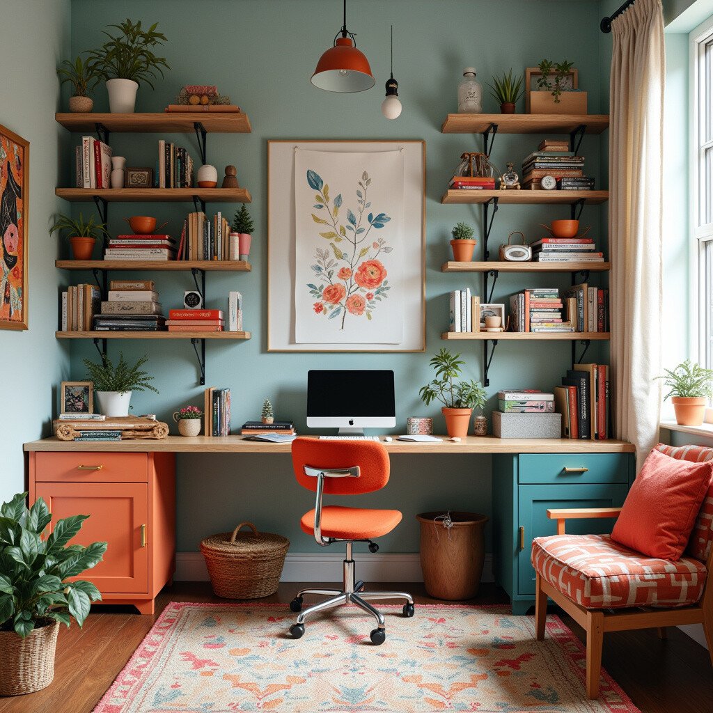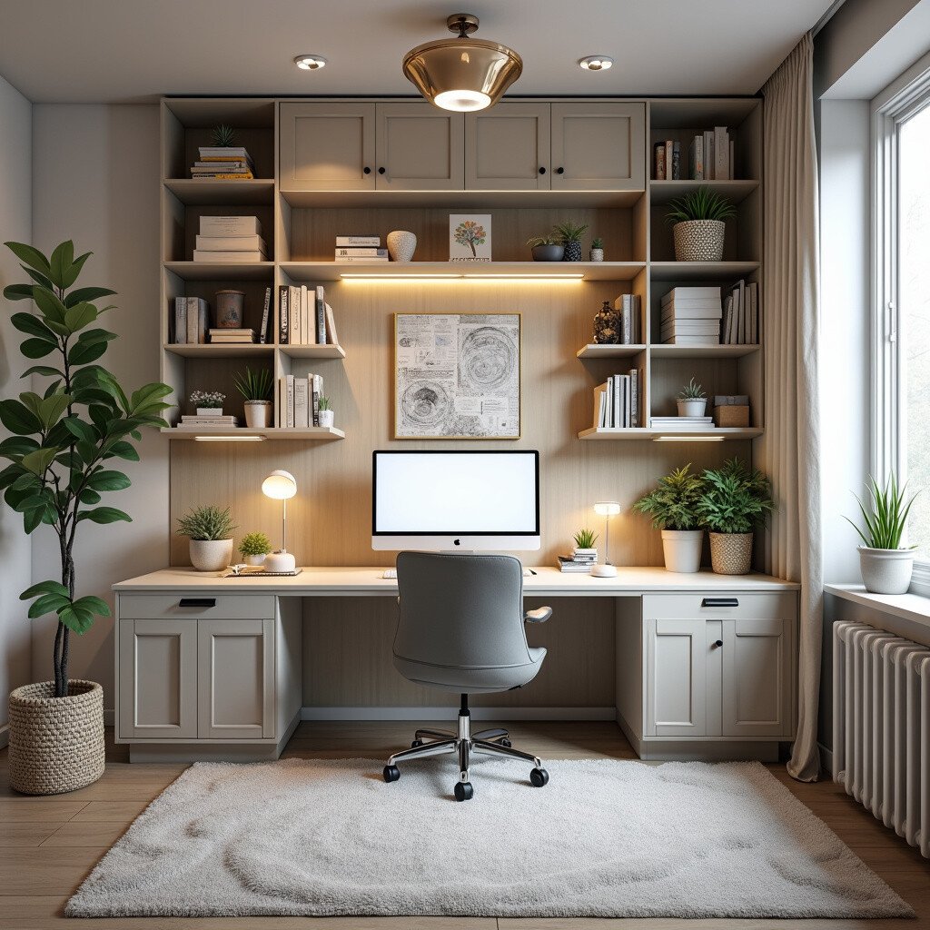 Use modular furniture and smart storage solutions. It’s a practical and aesthetic space that enhances productivity and creativity.