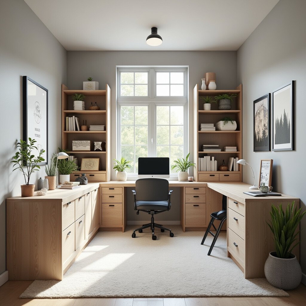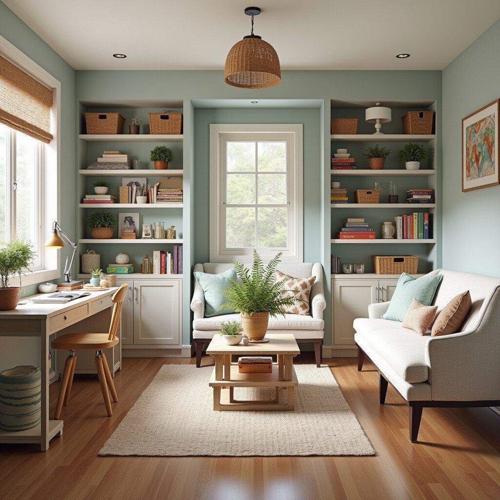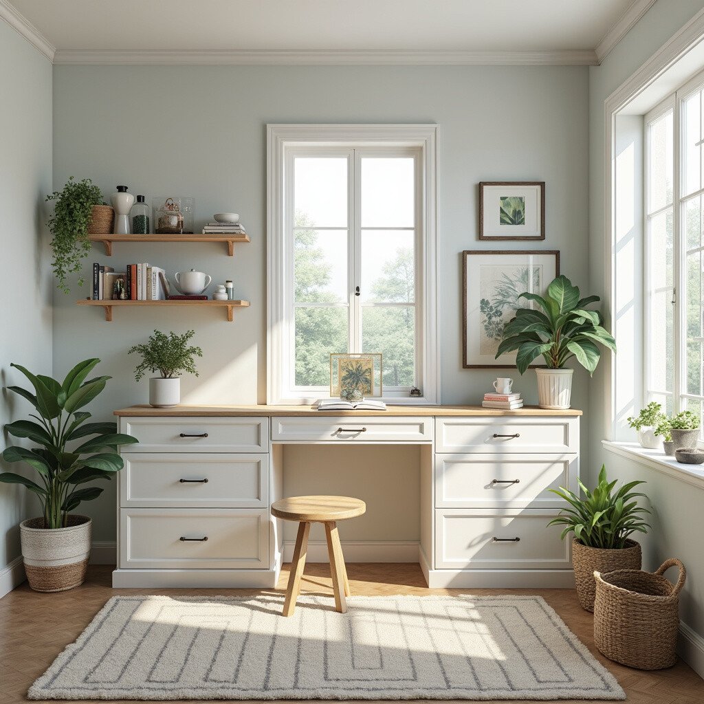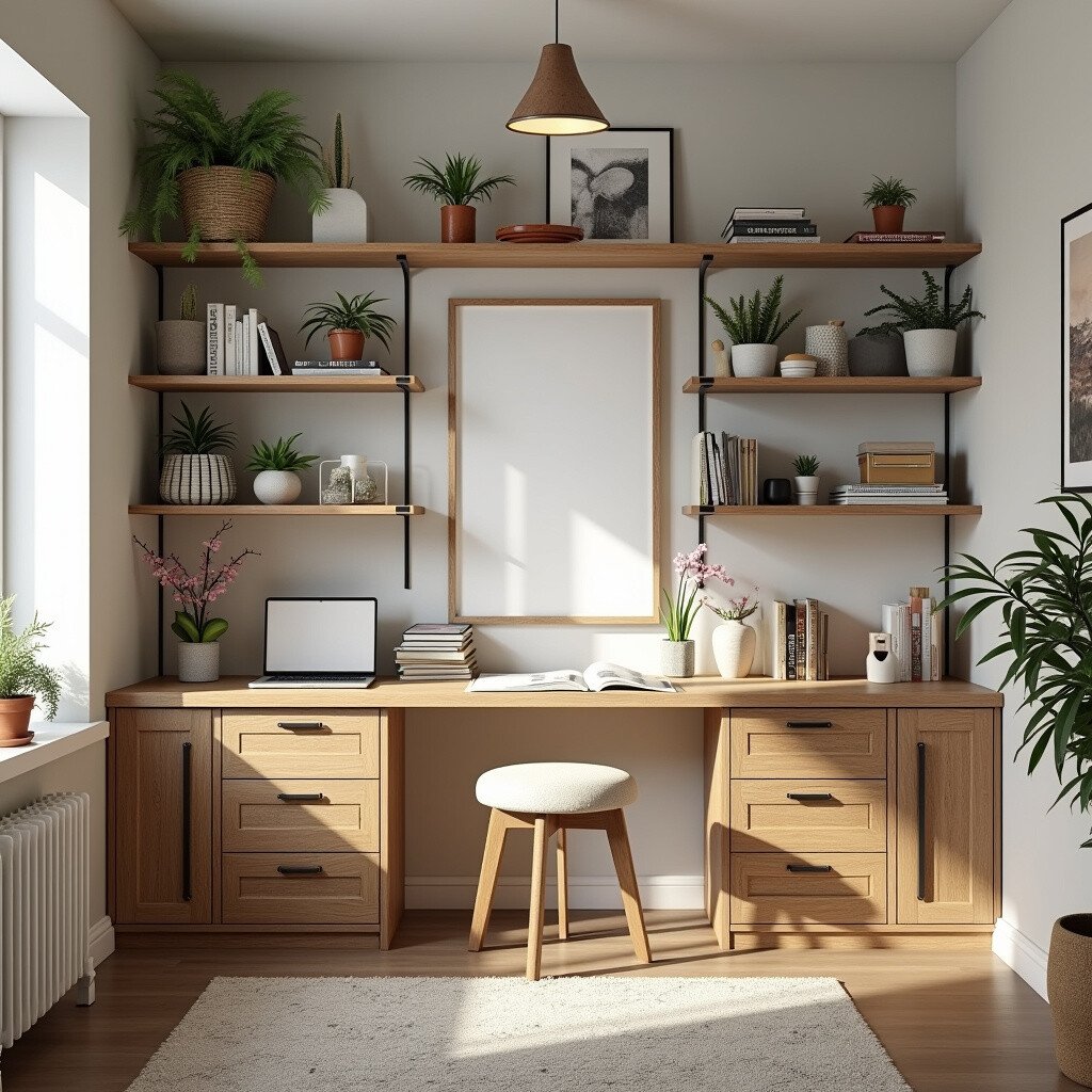 Opt for neutral tones and hidden storage solutions. This layout is cost-effective and provides a sense of calmness, perfect for enhancing your creative process.