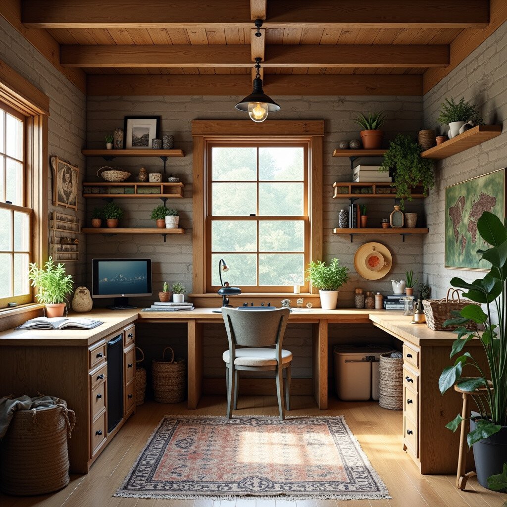 Step into a cozy, rustic craft room with wood finishes and vintage decor. This layout is for those who love a warm and inviting atmosphere.