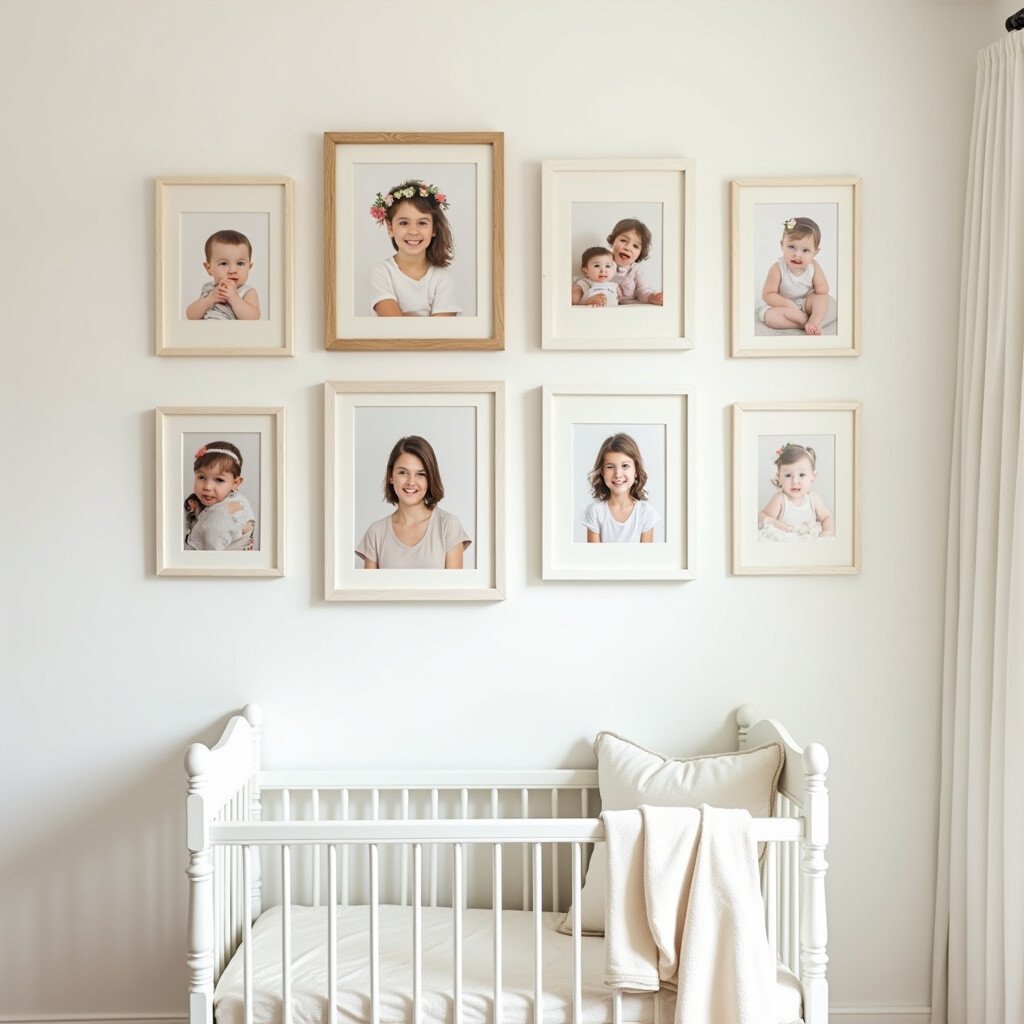 Choose different styles and sizes for variety. Look for frames with protective glass. Personal photos make the nursery feel like home.