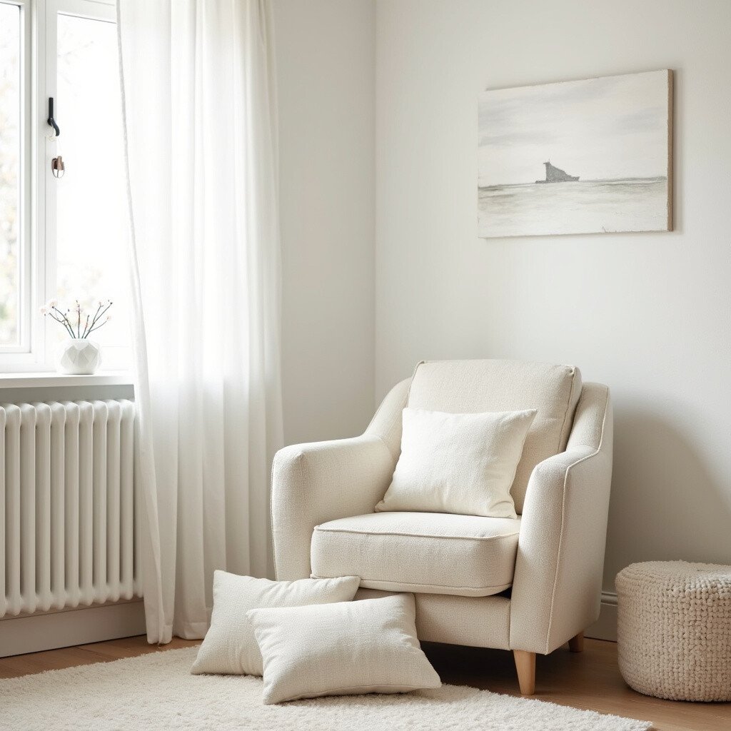 Add accent pillows in cream tones for comfort and style. They can be placed on the rocking chair or floor. Pillows add texture and warmth.