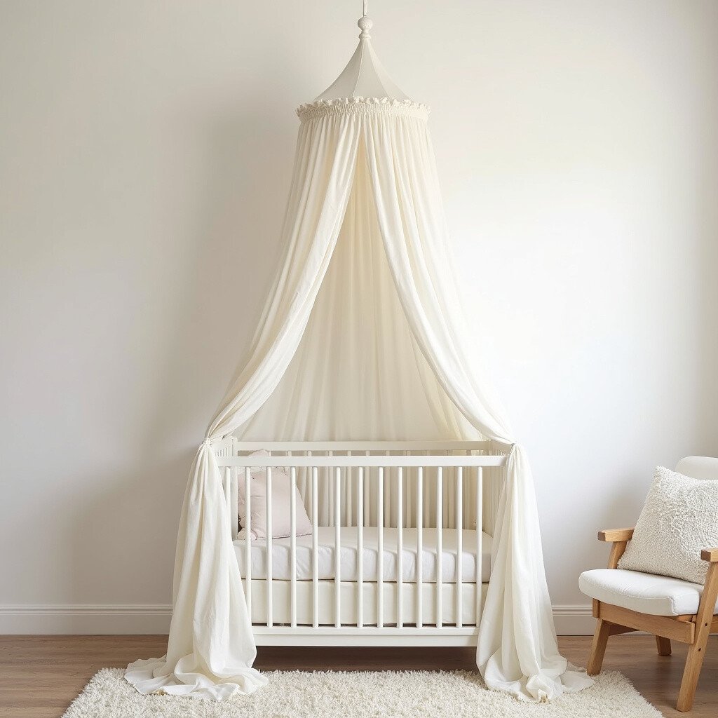 Hang a canopy in cream white over the crib or play area. It creates a cozy, magical nook for your baby. Canopies add a fairytale-like charm.