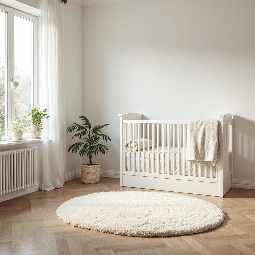 A plush cream rug adds warmth and comfort underfoot. It’s perfect for crawling, playing, and adding texture to the room. A soft rug is a must-have for any nursery.