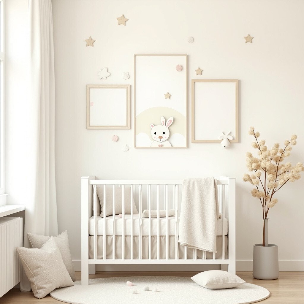 Add whimsical wall art in cream and pastel shades. Think of gentle animals, stars, or abstract patterns. These can spark your baby’s imagination.