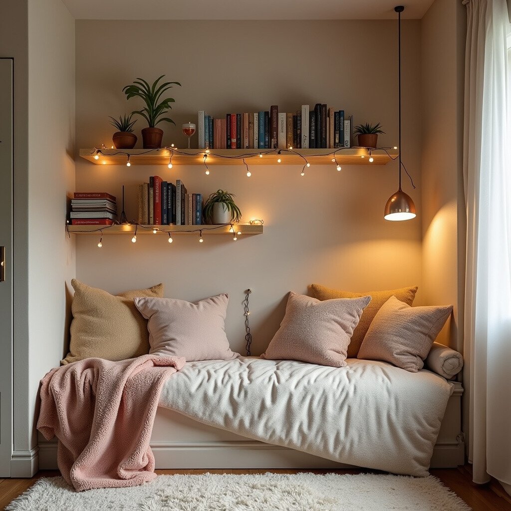 Use soft fabrics for comfort and a small lamp for evening reads. A budget-friendly solution is to use pillows and throws you already have.