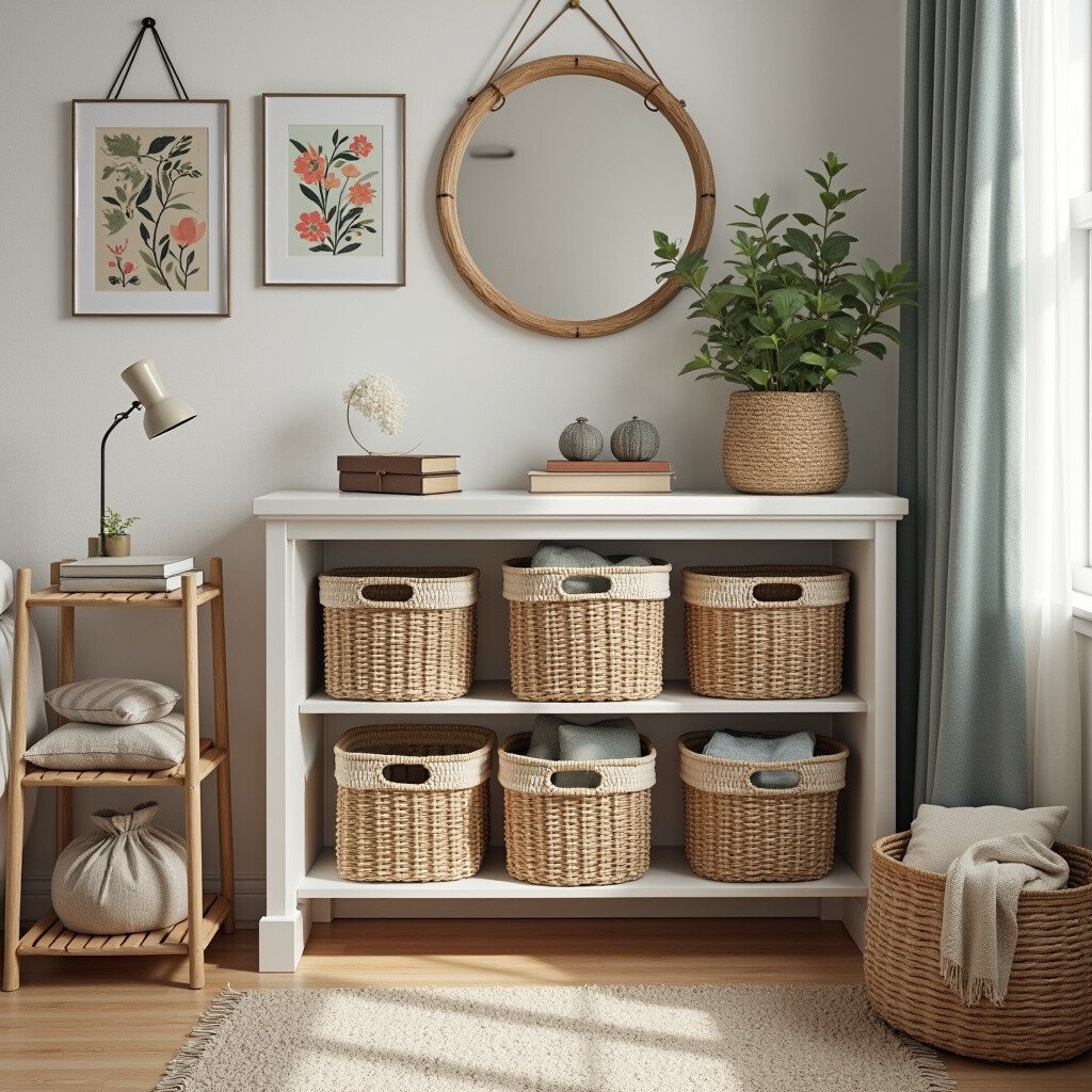 Storage doesn’t have to be boring. Use baskets, boxes, or even vintage suitcases for a stylish look. Not only do they help organize, but they can also add texture to your room.
