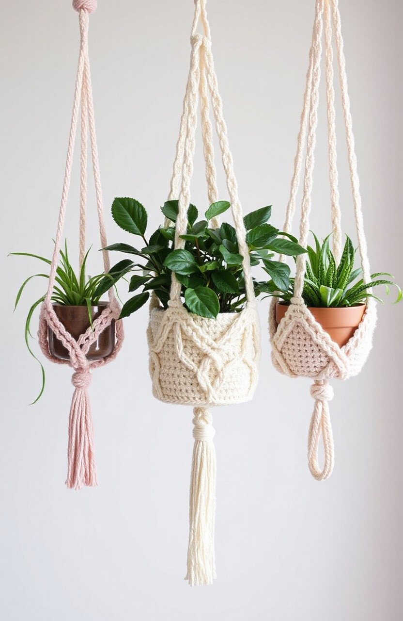 Add a touch of boho chic to your home with crochet plant hangers. They elevate your greenery, creating a floating garden effect.