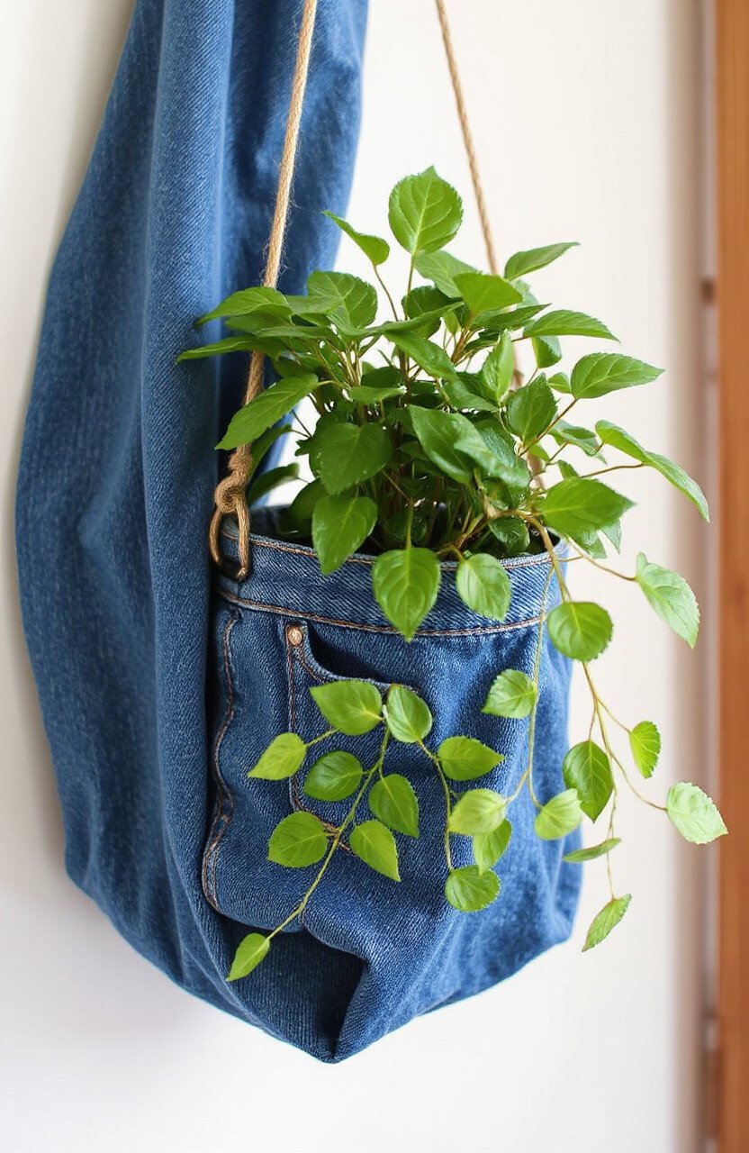 Give your plants a stylish home with a denim plant holder. Using the leg of an old pair of jeans, you can create a unique hanging planter. It’s a fresh and trendy way to bring a touch of nature indoors.