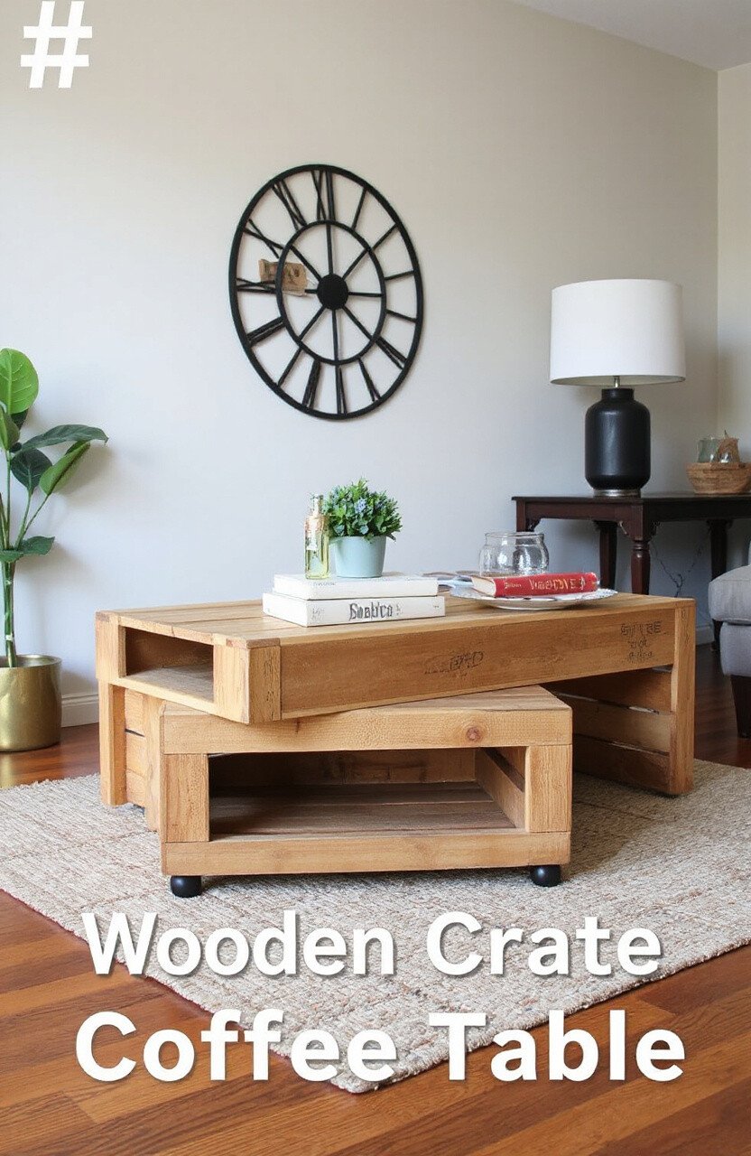 A wooden crate coffee table is rustic and practical. It’s great for living rooms.