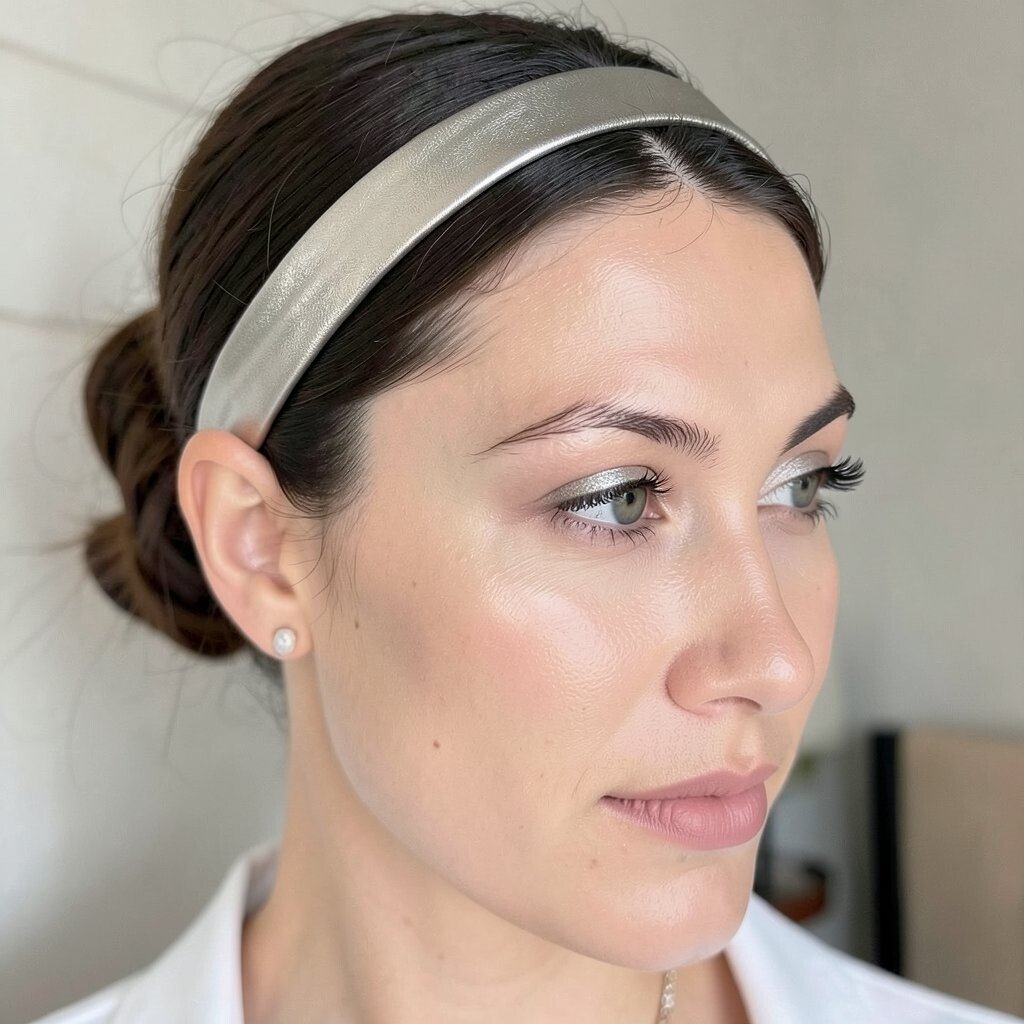 For a chic and modern look, try a metallic leather headband. Cut a strip of metallic leather and wrap it around a headband base for a sleek look.