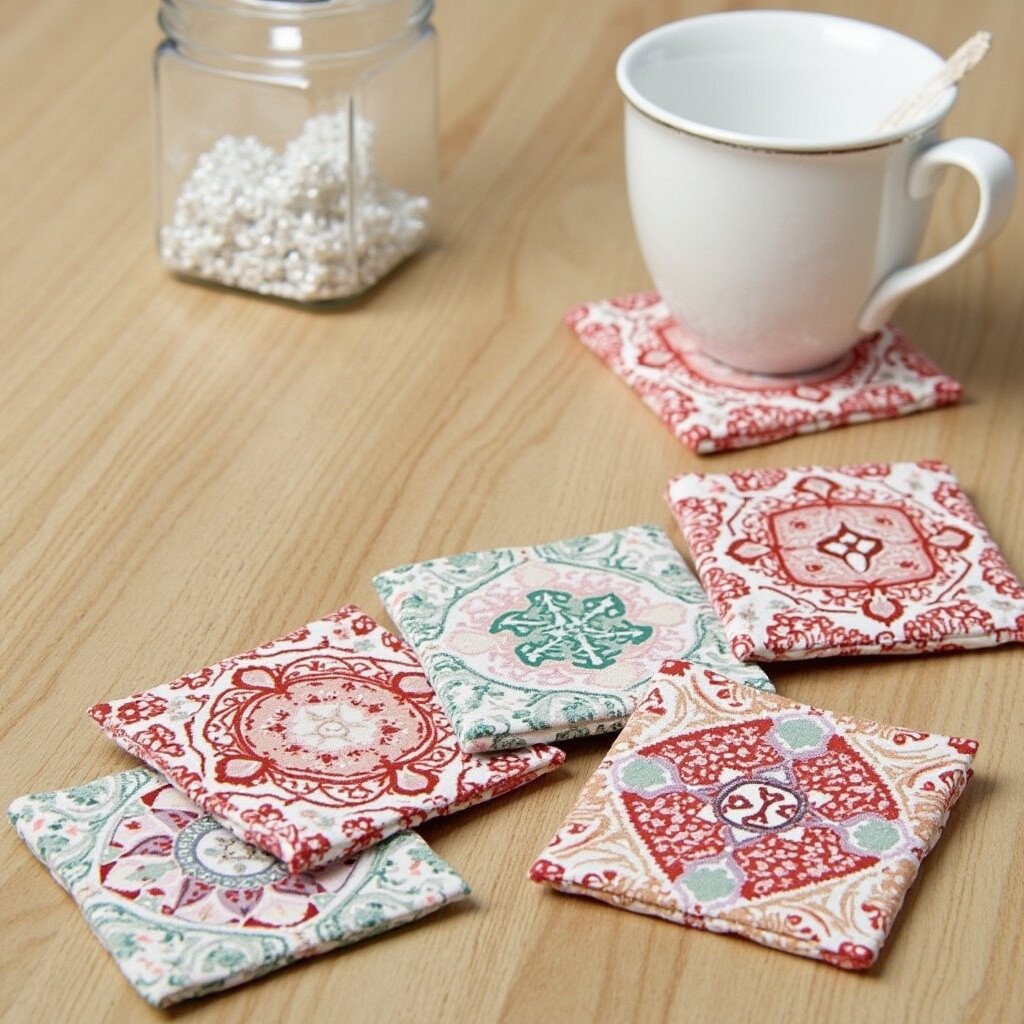 Add a touch of elegance to your table with fabric coasters. Sew squares of fabric with batting in between for extra absorption. These coasters protect your surfaces and bring charm to your decor.