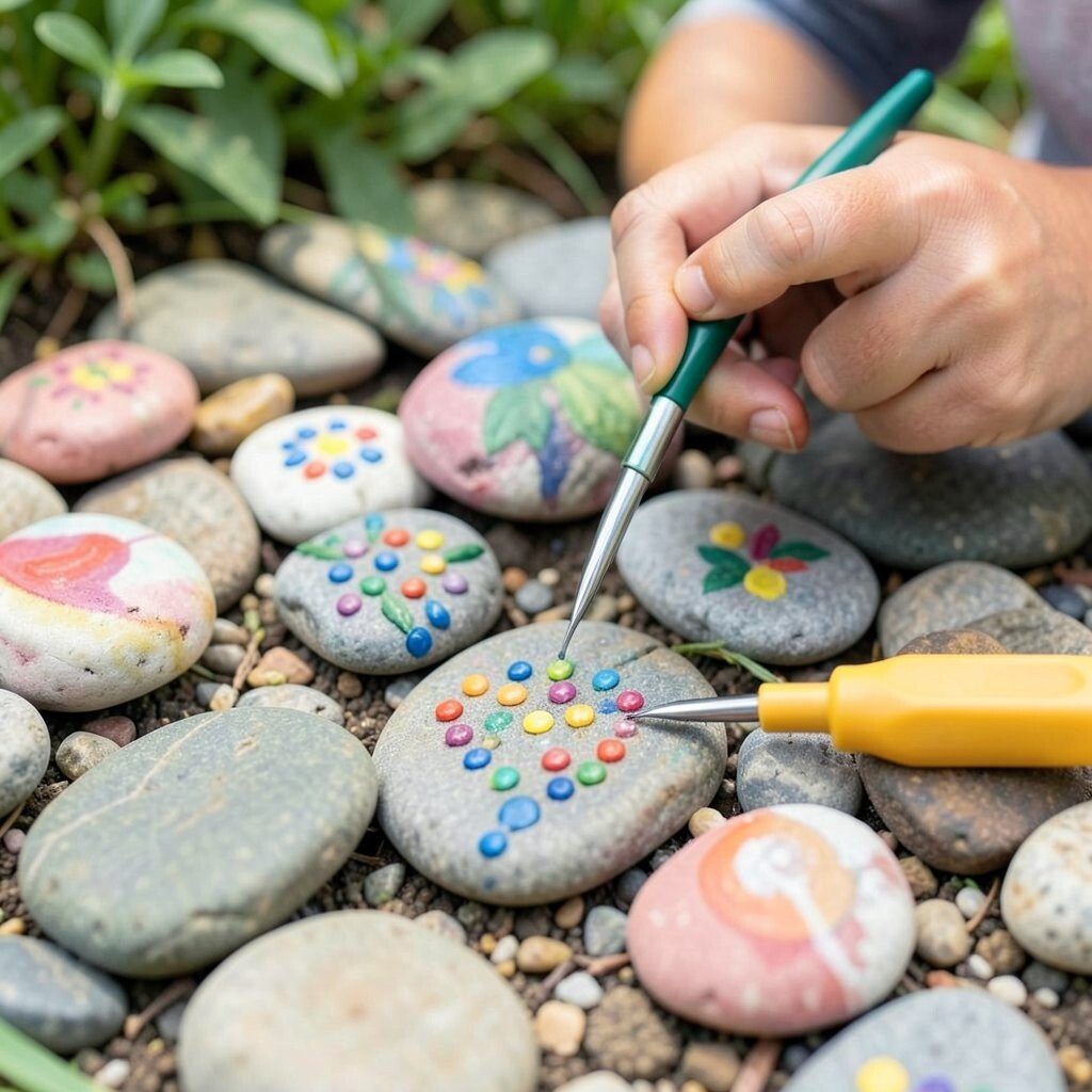Dotting rocks is an enjoyable outdoor activity. Choose smooth rocks and use dotting tools to create lively designs. You can use them as garden markers or decorative pieces.
