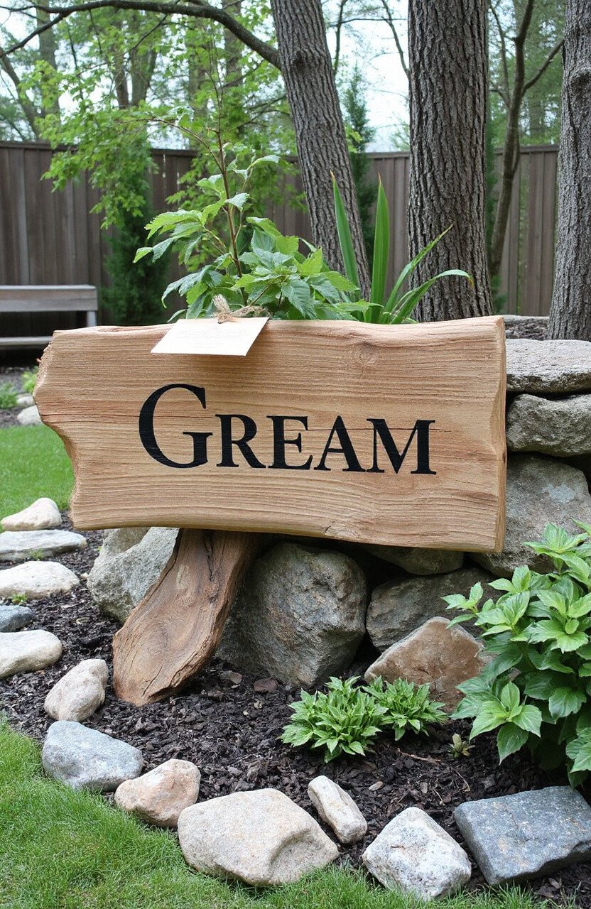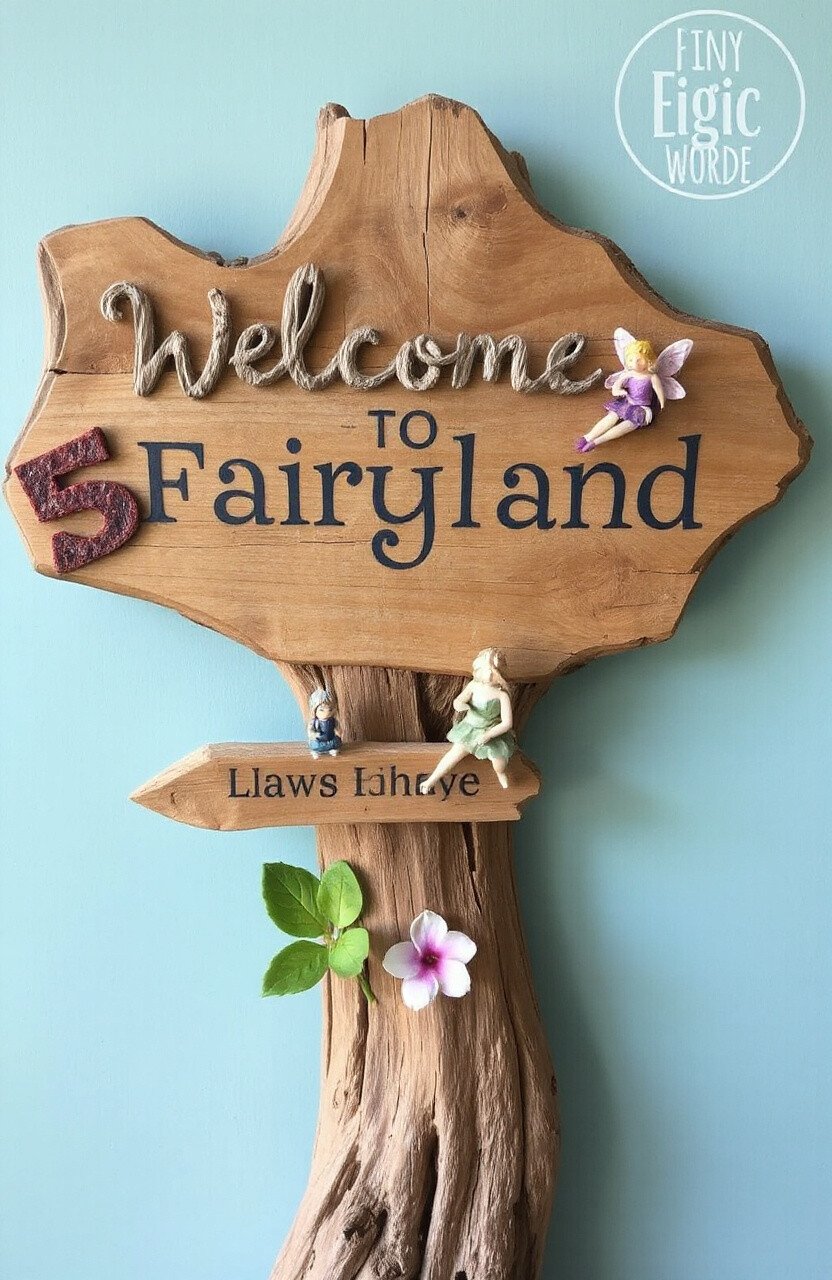 Add whimsy to your outdoor space with a fairy garden driftwood sign. Use enchanting phrases like “Welcome to Fairyland” to spark imagination.
