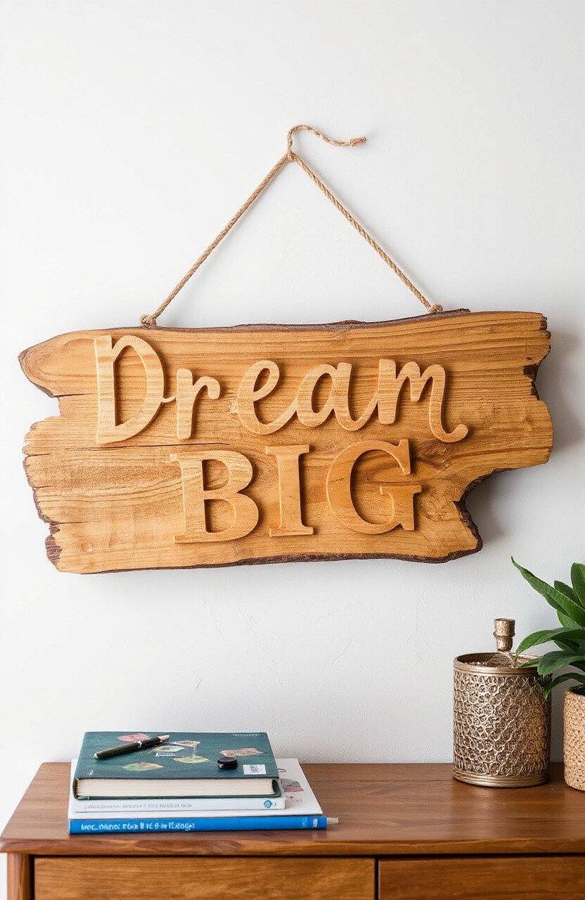 Inspire ambition with a “Dream Big” driftwood sign. Perfect for home offices or creative spaces, it encourages thinking outside the box.