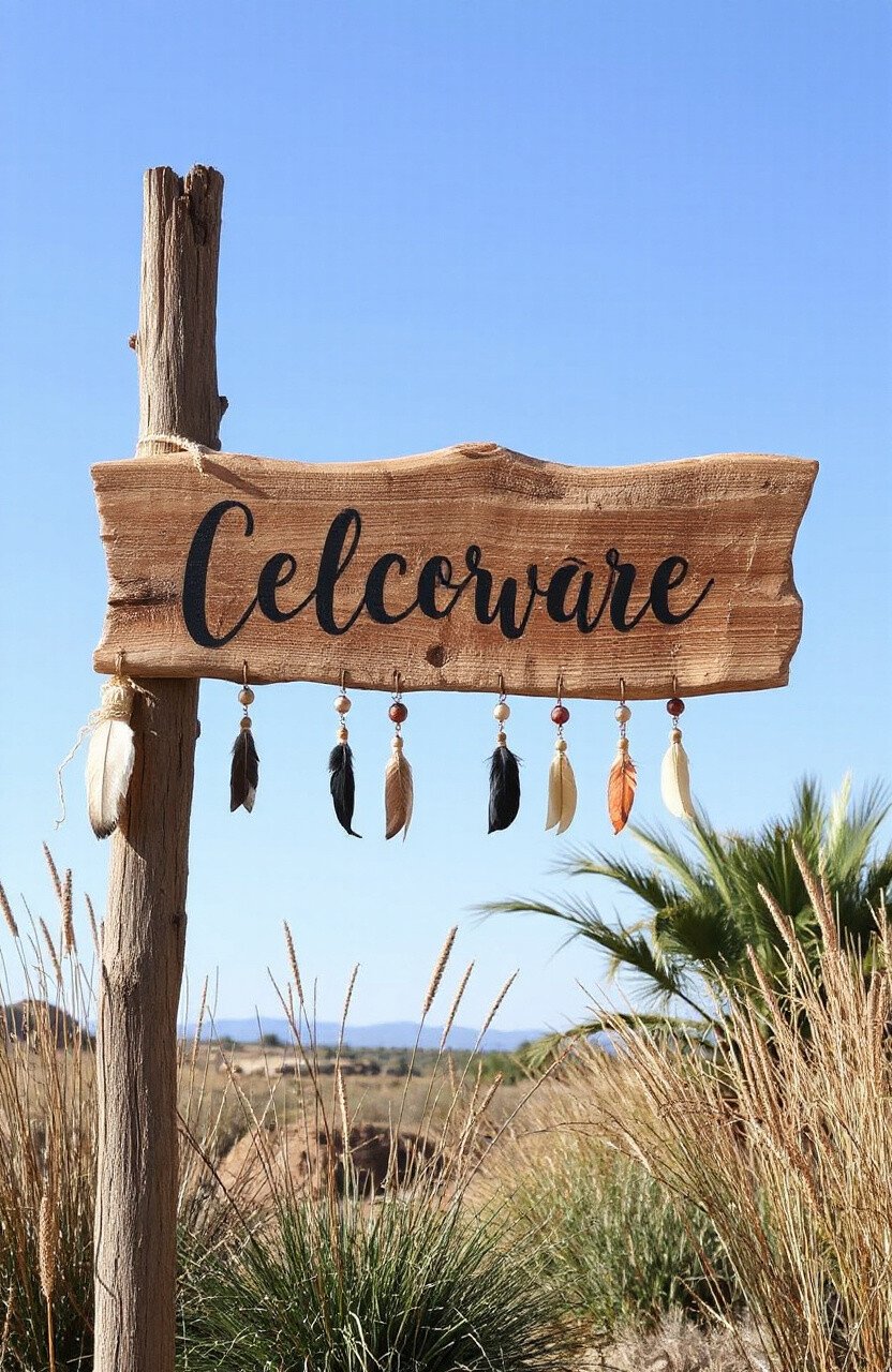 Embrace your inner free spirit with a boho festival-themed driftwood sign. Adorn it with feathers, beads, or tassels for added flair.