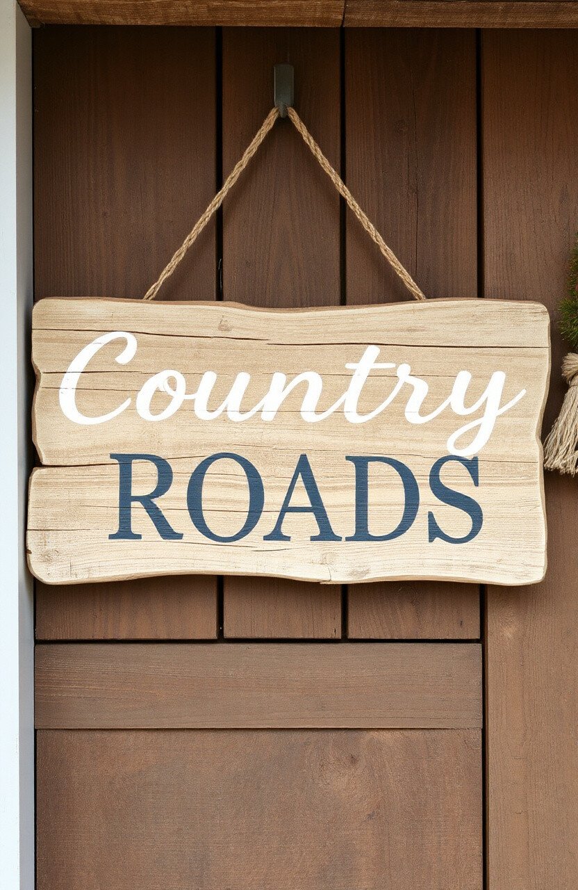 Bring the countryside charm into your home with a driftwood escape sign. Phrases like “Country Roads” capture the essence of rural life.