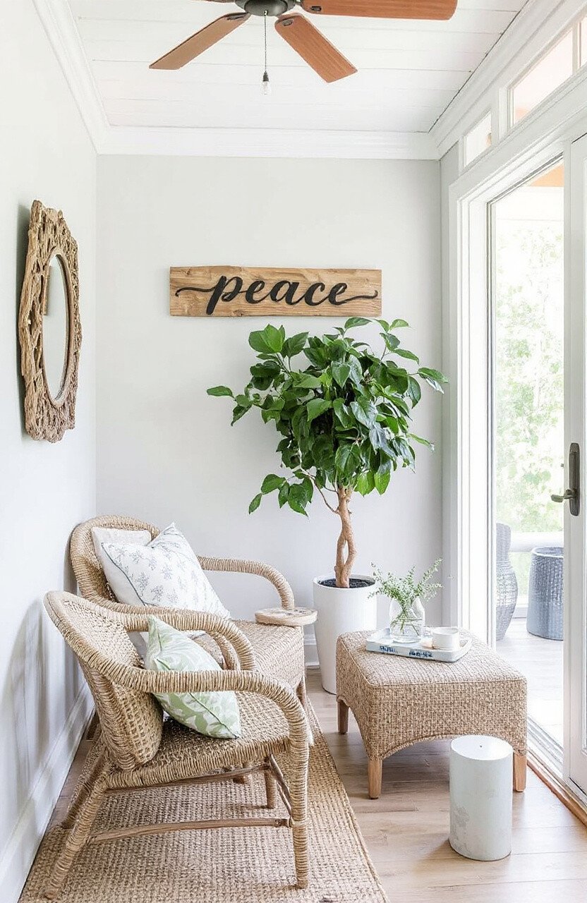 Enhance your sunroom’s tranquility with a driftwood serenity sign. Words like “Peace” or “Tranquility” fit perfectly in this relaxing space.