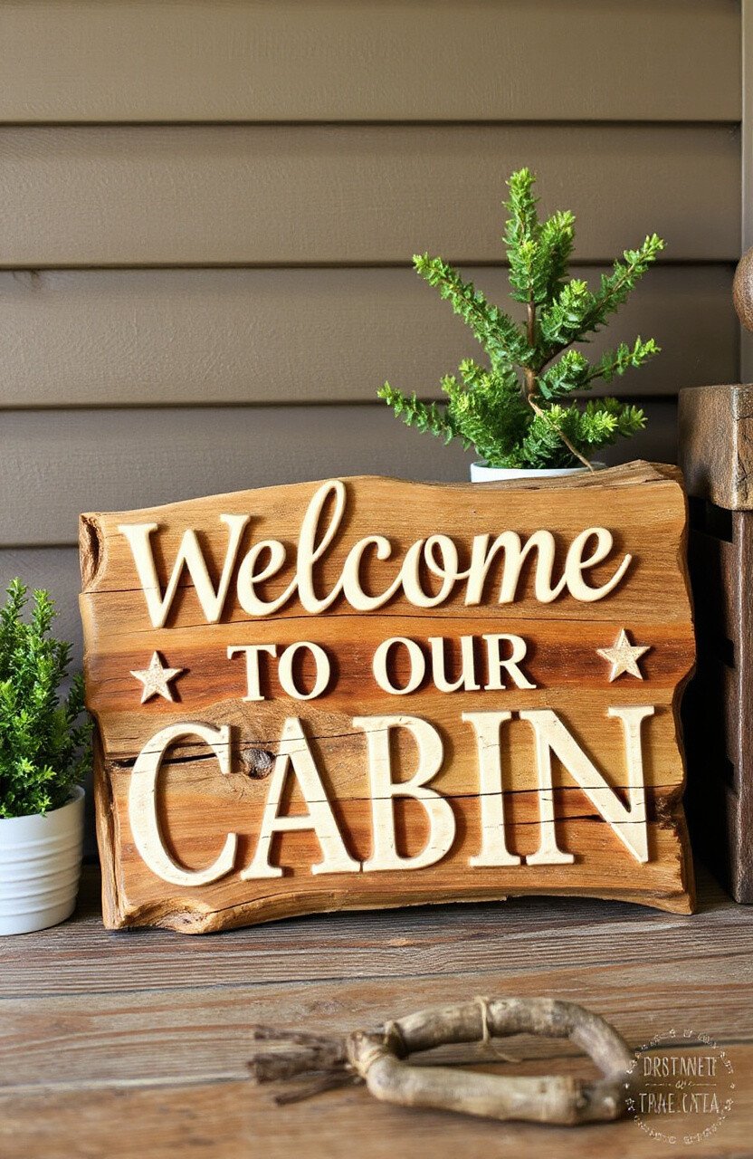 Capture the essence of a cozy cabin with a driftwood retreat sign. Phrases like “Welcome to Our Cabin” can make guests feel right at home.
