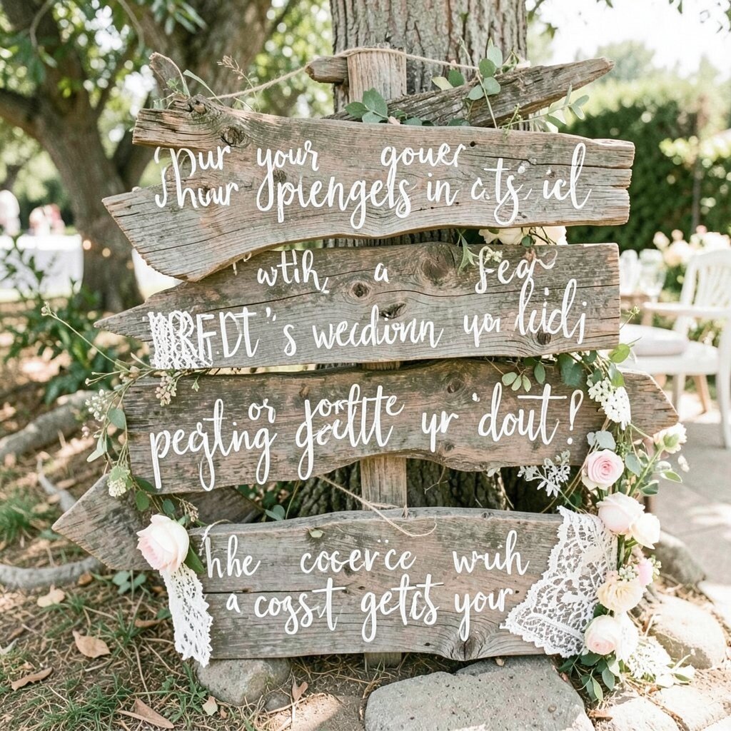 Create signs pointing to the ceremony, reception, or photo booth. Add romantic elements like flowers or lace for a personal touch. These signs are a cost-effective way to direct guests while complementing your decor.