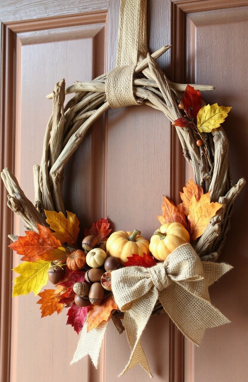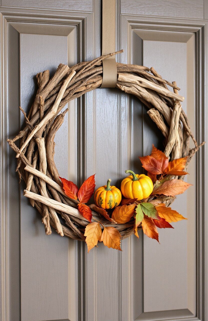 Celebrate the beauty of fall with an Autumn Harvest wreath. Use driftwood combined with autumn leaves, acorns, and small pumpkins for a festive look.