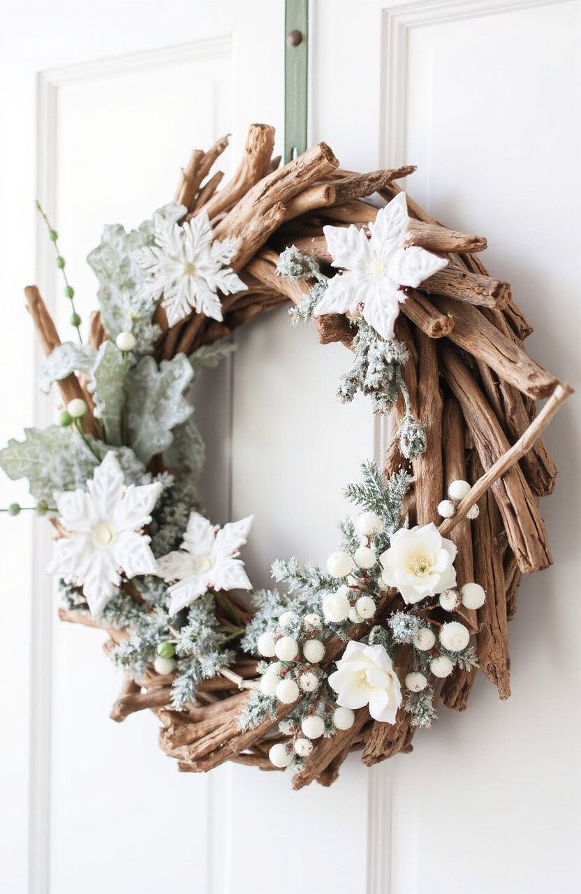 Transform your home into a Winter Wonderland with a driftwood wreath adorned with white berries and snowflakes. This design captures the magic of the winter season.