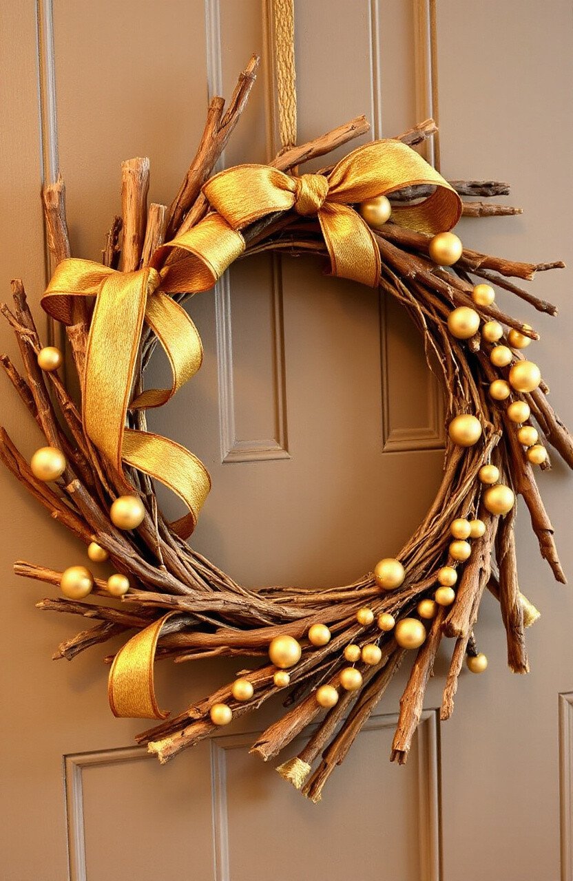 Add a touch of luxury with a Golden Glow wreath. Use driftwood and gold accents like ribbons and beads for a glamorous look.