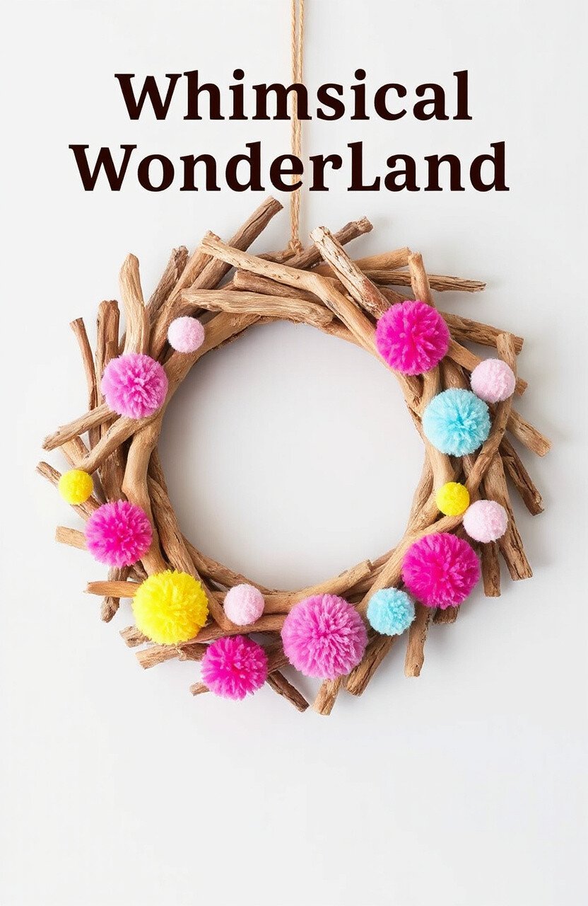 Enter a Whimsical Wonderland with a wreath that combines driftwood with playful elements like pom-poms and bright colors.