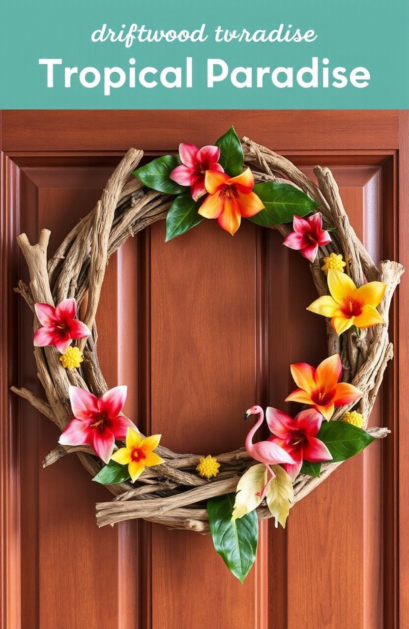 Escape to a Tropical Paradise with a wreath that features vibrant colors and exotic elements. Use driftwood as the base and add tropical flowers and leaves for a lively, cheerful look.
