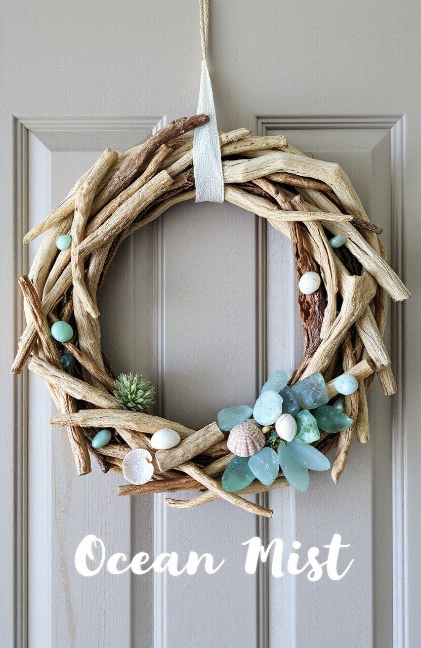 Capture the gentle beauty of the sea with an Ocean Mist wreath. Use driftwood and soft blue elements like sea glass and small shells.