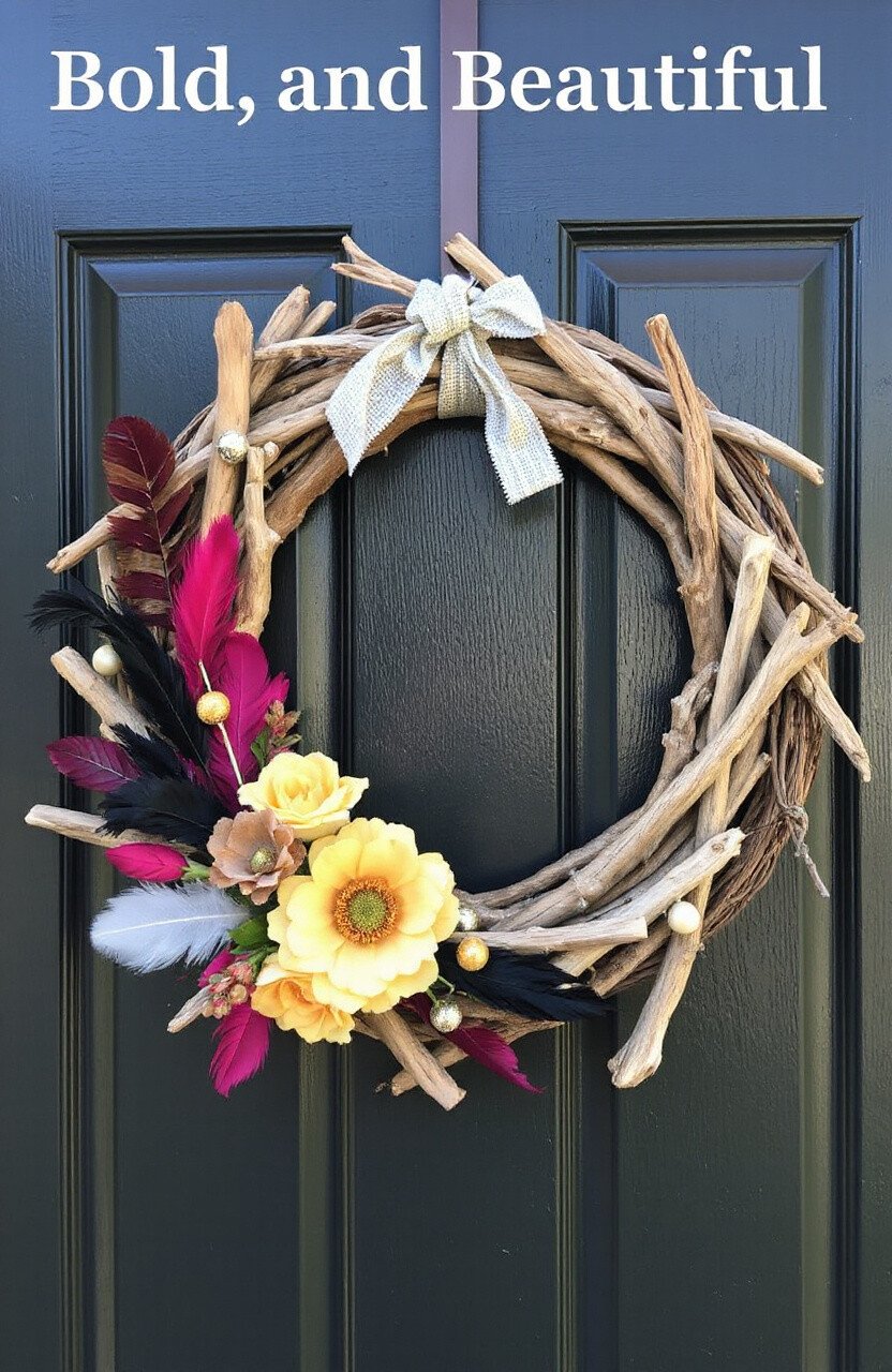 Make a statement with a Bold and Beautiful wreath. Use large pieces of driftwood combined with bold colors and striking elements like feathers or beads.